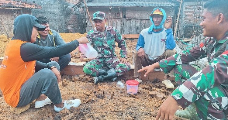 Di sela pengerjaan pembangunan Rumah Tidak Layak Huni (RTLH) milik Dwi Andrianto, warga setempat, anggota Satgas TMMD bersama warga tampak beristirahat sejenak. Mereka duduk berbaur, menikmati kopi hangat, dan berbincang santai. Tawa ringan yang tercipta menjadi pelepas lelah setelah bekerja sejak pagi.